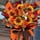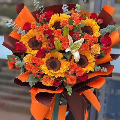花 材5支向日葵,1支多頭白百合,11支紅玫瑰,橙色泡泡、紅豆、尤加利葉間插