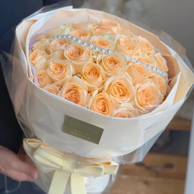 花 材33支香檳玫瑰,1條珍珠鏈裝飾